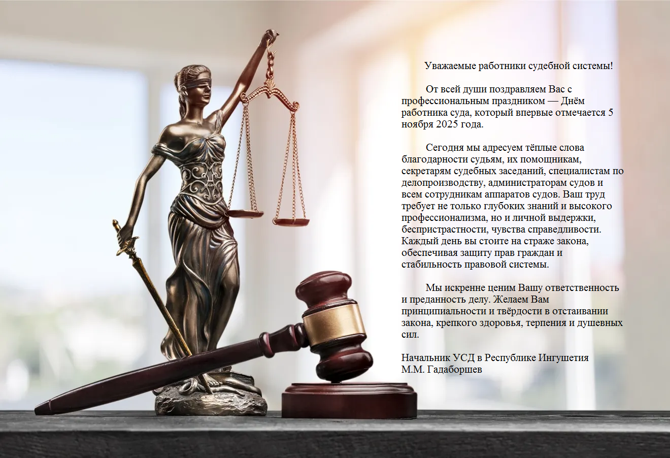 Поздравление начальника Управления Судебного департамента в Республике Ингушетия по случаю профессионального праздника Дня работника суда